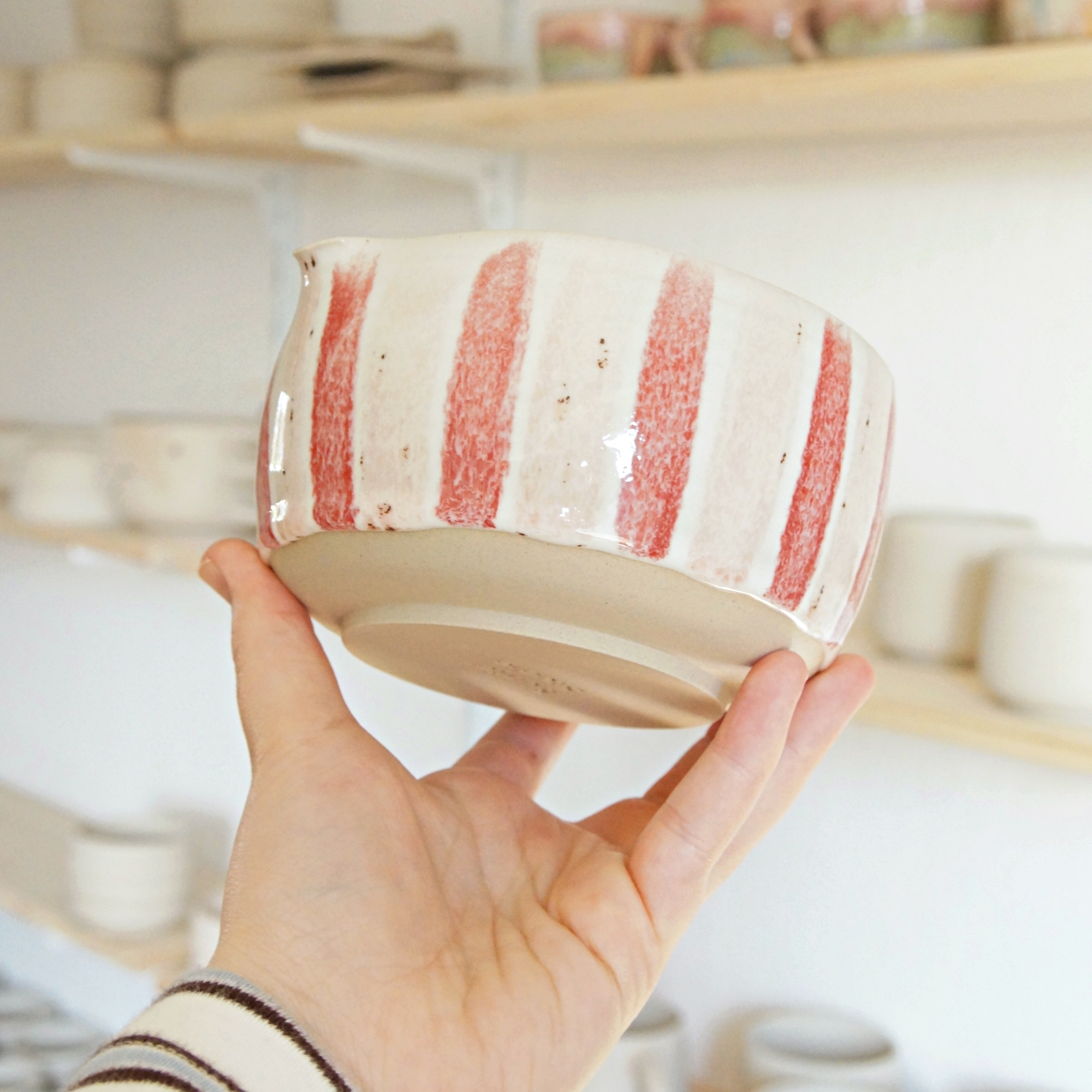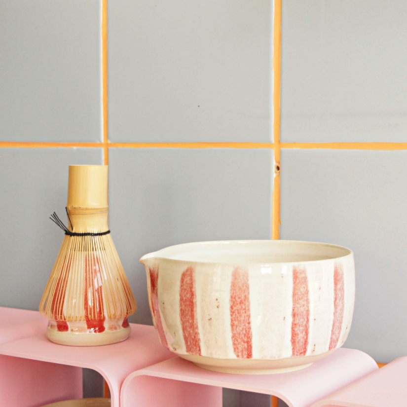 Diese handgetöpferte Matcha-Schale ist ein Unikat mit klarer, ruhiger Form. Sie liegt gut in der Hand und eignet sich ideal für die tägliche Zubereitung von Matcha. Die Glasur „Erdbeereis“ kombiniert eine helle Basis mit dezenten rot-pinken Streifen. Kleine Unregelmäßigkeiten und Sprenkel entstehen bewusst im Herstellungsprozess und machen jede Schale individuell.