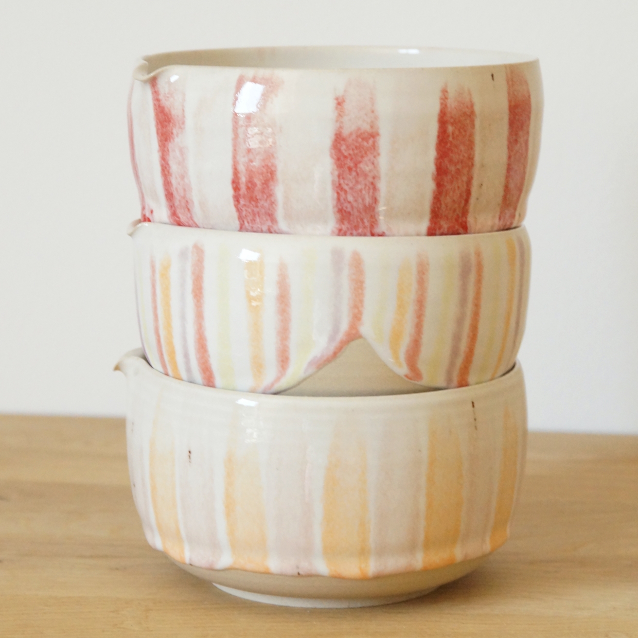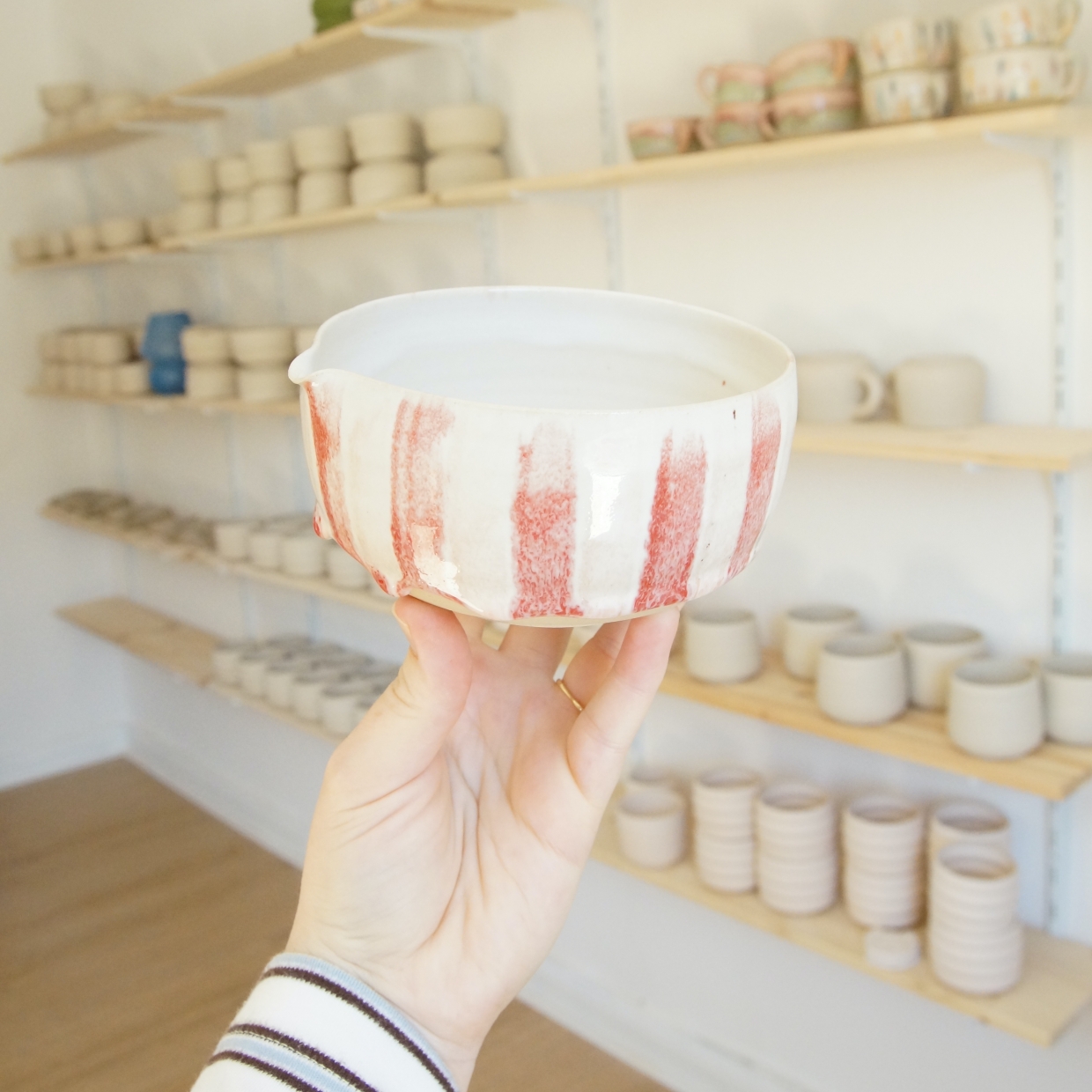Handgemacht und funktional: Matchaschale mit Ausguss und passender Chasenhalter in zarter Erdbeereis-Glasur – perfekt für stilvollen Matcha-Genuss.